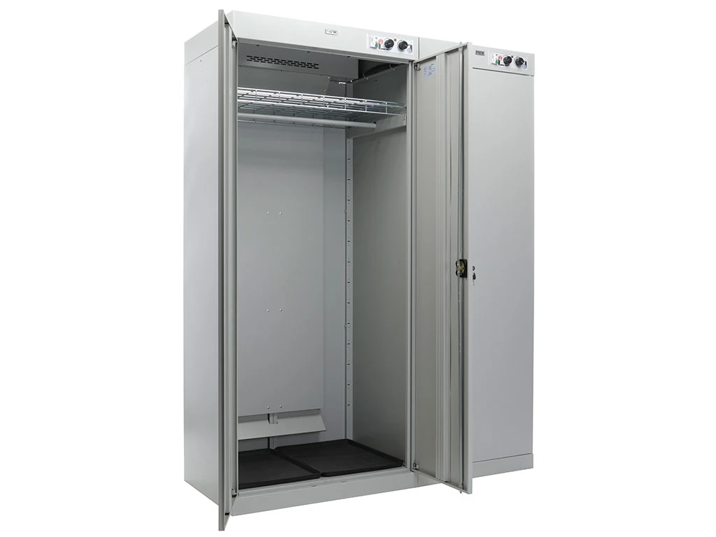 Шкафы Сахара 5 предназначены для сушки влажного или мокрого белья и одежды, обуви, спортивной и рабочей формы, профессиональной униформы, группы персонала из пяти человек Сушка производится за счет циркуляции подогретого воздуха внутри шкафа. Могут применяться на строительных объектах, производствах, спортивных комплексах, детских садах, школах, буровых и нефтяных станциях, военизированных подразделениях и т.д. Шкаф состоит из двух независимых секций. Большая секция предназначена для одежды, с перекладиной для вешалок и полкой. Малая оборудована специальными патрубками и предназначена для сушки обуви. Вентилятор с мощностью 2500 Вт и производительностью 180 м3/ч позволяет просушить влажные и мокрые вещи. На шкафы установлен замок CyberLock CL/3P AM1 556-91 с 2-х сторонней ригельной системой запирания на 2000 комбинаций.Технические характеристики