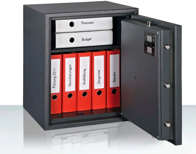 ― огнестойкость LFS 30P по евро-стандарту EN 15969 – то есть, купюры и документы защищены от воздействия огня и жара не менее получаса. - Защитные свойства сейфа обусловлены структурой типа «сэндвич»: между двумя слоями стали (корпус) и тремя слоями (дверь) помещён специальный наполнитель, обладающий повышенной устойчивостью к температуре горения и режущим инструментам.
