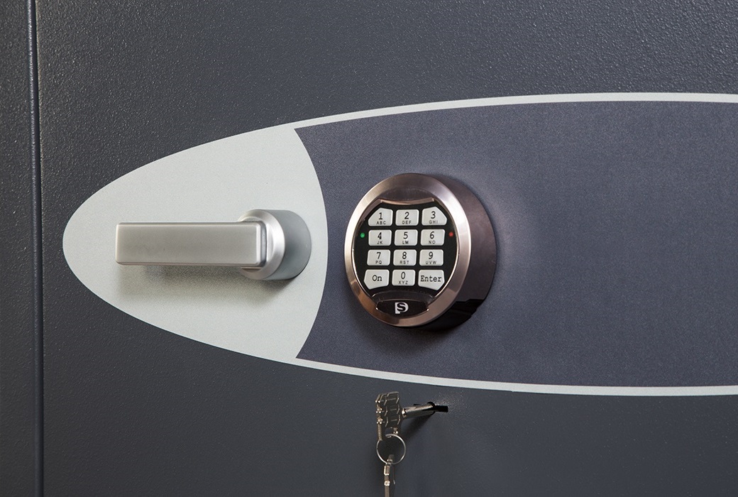 - На дверь модели HS9072E устанавливается пара замков высокой степени секретности (class 2, VdS) – двухбородочный ключевой и электронный Phoenix с защитой от подбора кода и набором полезных в плане безопасности и удобных функций: сочетание мастер-кода с кодом пользователя (основной владелец может менять его), Time Delay (окно открытия и временна́я задержка), Dual Code (двойной код) и пр. Область замков усиливается твердосплавной пластиной из легированной стали.