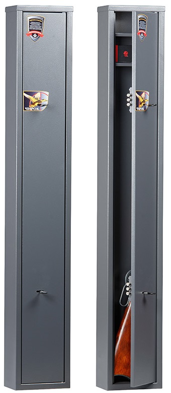 — Предназначен для хранения ружья с максимальной высотой до 1.3 м (при снятых полках). При одной установленной полке сейф вмещает ружье с высотой до 1.21 м, а при двух установленных полках – до 1.12 м.— Толщина лицевой панели 1.5 мм.