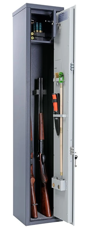 - В верхней части сейфа расположен трейзер (запирающееся на ключ отделение для патронов) размерами 199/147×246×173/90 мм. За узким трейзером остаётся свободное пространство, которое позволяет хранить ружья, по длине соответствующие высоте всего сейфа.